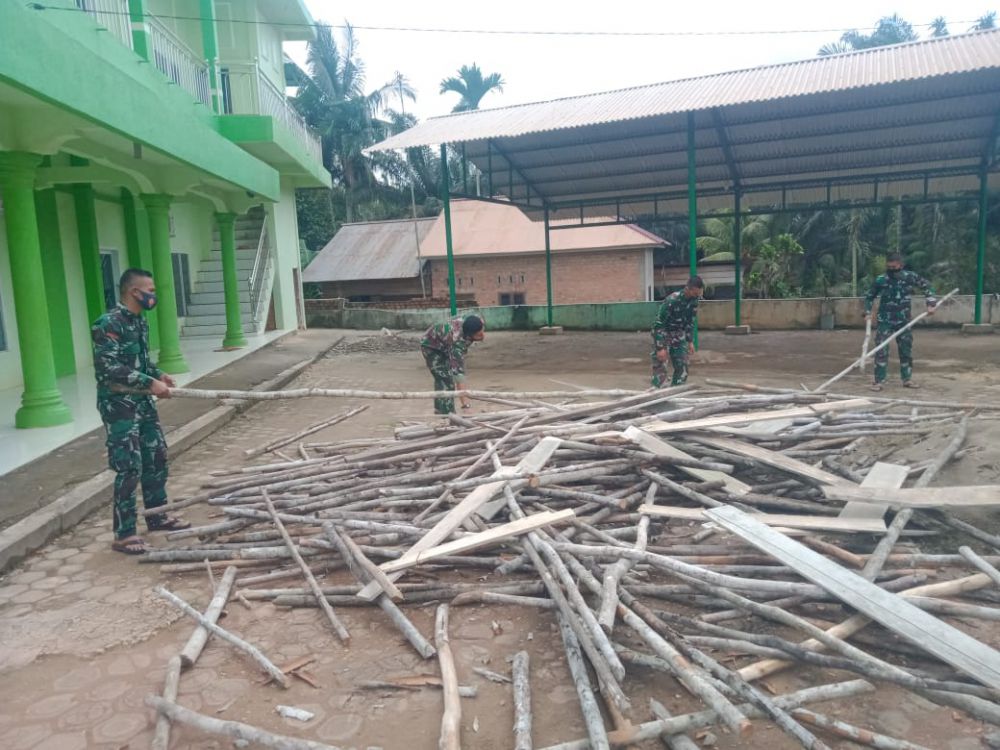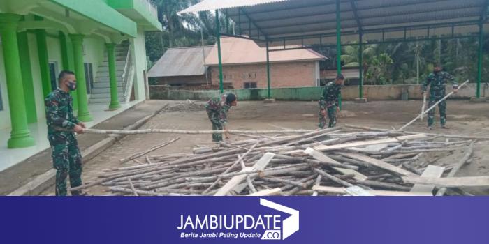 JAMBIUPDATE.CO, JAMBI - Demi menjaga keselamatan dan kebersihan dilingkungan Masjid Raudhatul Hasanah yang bertempat di RT 22 Desa Mekar Jaya Satgas TMMD 110 Kodim 0415/BTH, berjibaku membersihkan tumpukan kayu yang masih berserakan dihalaman Masjid, Senin (8/3/2021) pagi.