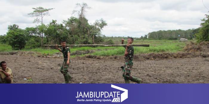 JAMBIUPDATE.CO, JAMBI - Sebanyak 30 batang kayu plagas ditebang Satgas TMMD ke 110 Kodim 0415/Batanghari di Desa Sungaiterap, untuk dibuatkan gelagar di lahan gambut jalan penghubung dua desa, Selasa (9/3/2021).