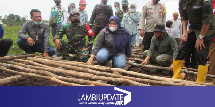 JAMBIUPDATE.CO, JAMBI - Dandim 0415/Batanghari, Kolonel J Hadiyanto dan Bupati Muarojambi, Hj Masnah Busro, bantu Satgas TMMD ke 110 dalam pemasangan galar, di Desa Sungaiterap, Sabtu (13/3/2021).