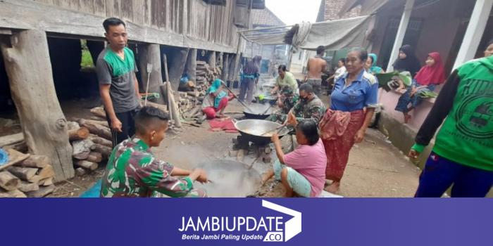 JAMBIUPDATE.CO, JAMBI - Satgas TMMD ke 110 Kodim 0415/Batanghari bantu Emak-emak Desa Sungaiterap dalam pembuatan kue tradisonal, Selasa (16/3/2021) siang.