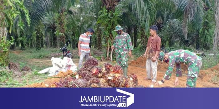 JAMBIUPDATE.CO, JAMBI - Di tengah sengang waktu, Satgas TMMD ke 110 Kodim 0415/Batanghari, belajar memanen sawit di salah satu kebun warga Desa Mekarjaya, Rabu (17/3/2021).