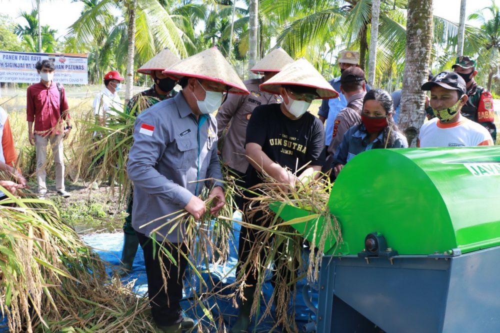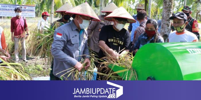 JAMBIUPDATE.CO, KUALATUNGKAL - Bupati Tanjung Jabung Barat Anwar Sadat, melakukan kegiatan Panen Padi Raya Kampung Tangguh Siginjai di RT 13, Kelurahan Patunas.
