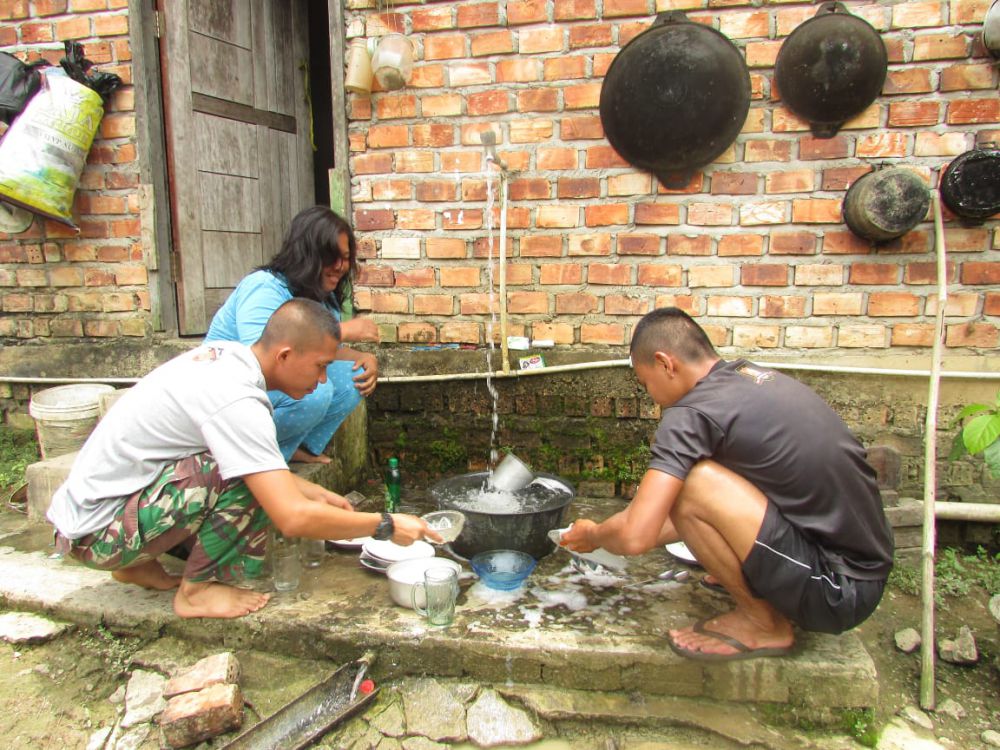 JAMBUPDATE.CO, JAMBI - Satgas TMMD ke 110 Kodim 0415/Batanghari nyuci piring bersama di rumah orang tua asuh, Kamis (18/3/2021).