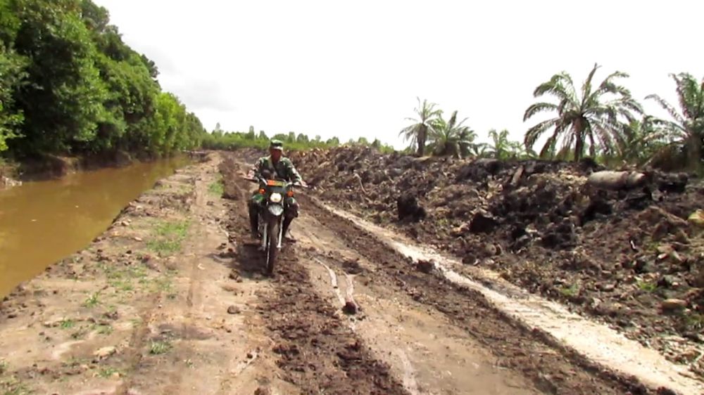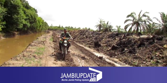 JAMBIUPDATE.CO, JAMBI - Dengan menggunakan sepeda motor, Dan SSK, Kapten Inf Rilman, tinjau lokasi jalan yang bakal dibuka 1.8 Kilometer dari Desa Sungaiterap menuju Desa Sungaigelam, dalam program TMMD ke 110 Kodim 0415/Batanghari, Minggu (21/3/2021).