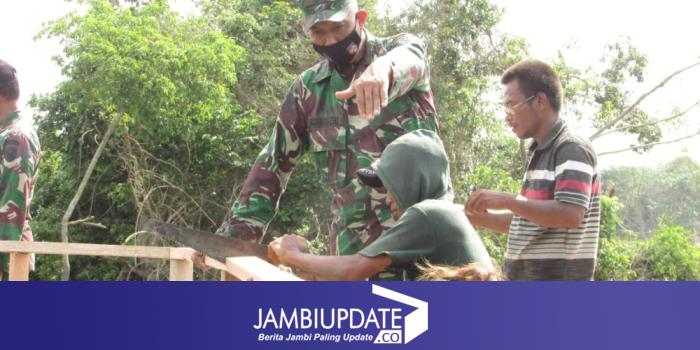 JAMBIUPDATE.CO, JAMBI - Pasi Bhakti TNI Ster Korem 042/Gapu, Mayor Inf Azfahrizal, bantu tukang membuat jembatan, dalam program TMMD ke 110 Kodim 0415/Batanghari, di Desa Sungaiterap, Sabtu (20/3/2021) kemarin.