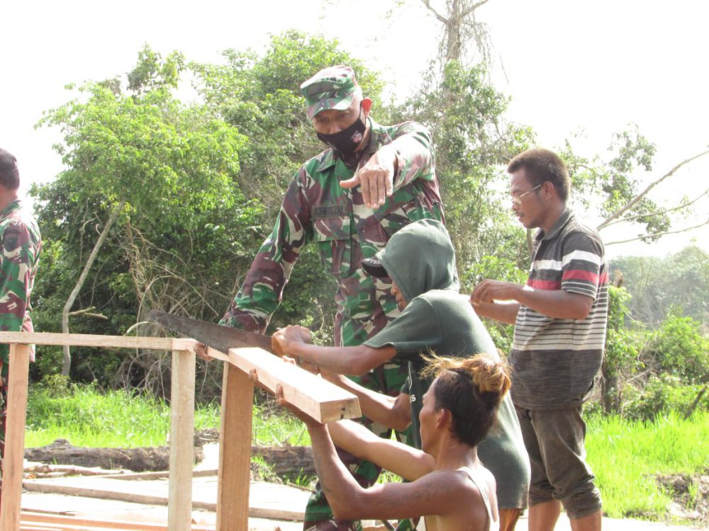 Terlihat, Pasi Bhakti Ter Korem 042/Gapu itu, langsung membantunya, dengan cara memegang kayu yang akan akan dipotong.