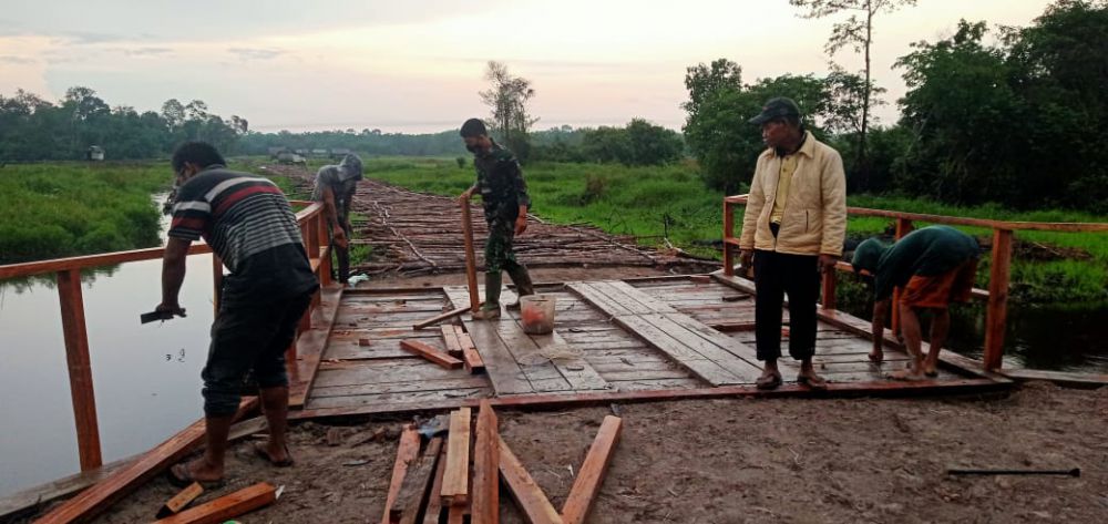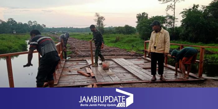 JAMBIUPDATE.CO, JAMBI - Meskipun hujan, Satgas TMMD ke 110 Kodim 0415/Batanghari bersama tukang, melanjutkan pengerjaan jembatan di Desa Sungaiterap, Selasa(23/3/2021) kemarin.