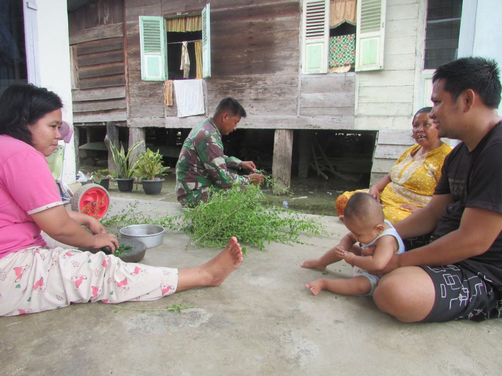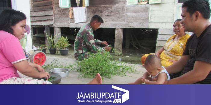 JAMBIUPDATE.CO, JAMBI – Di sela waktu senggang, Satgas TMMD ke 110 Kodim 0415/Batanghari bantu warga Desa Sungaiterai membuat inai yang berasal dari daun henna atau pacar, Selasa (30/3/2021).