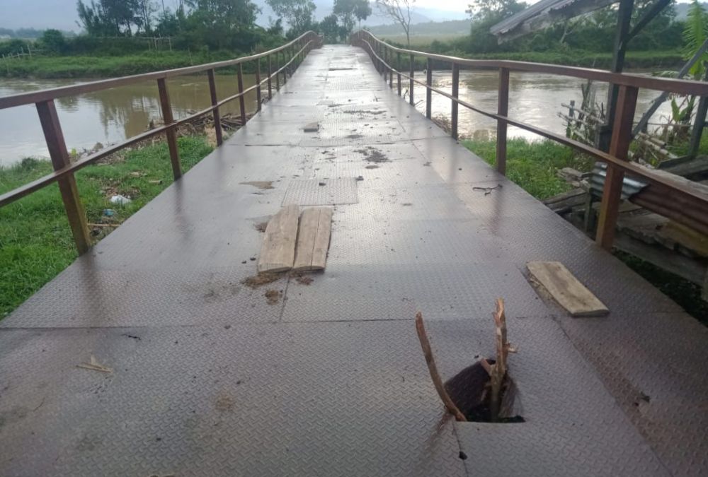 Pantauan media ini dilokasi, terlihat alas jembatan yang terbuat dari besi sudah rusak, hingga berlobang. Bahkan beberapa diantaranya, terpaksa dilakukan penyangga dengan papan agar warga tidak terjatuh ketika menyebrang.