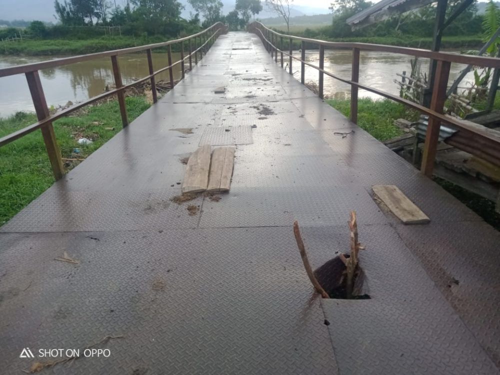 Pantauan media ini dilokasi, terlihat alas jembatan yang terbuat dari besi sudah rusak, hingga berlobang. Bahkan beberapa diantaranya, terpaksa dilakukan penyangga dengan papan agar warga tidak terjatuh ketika menyebrang.
