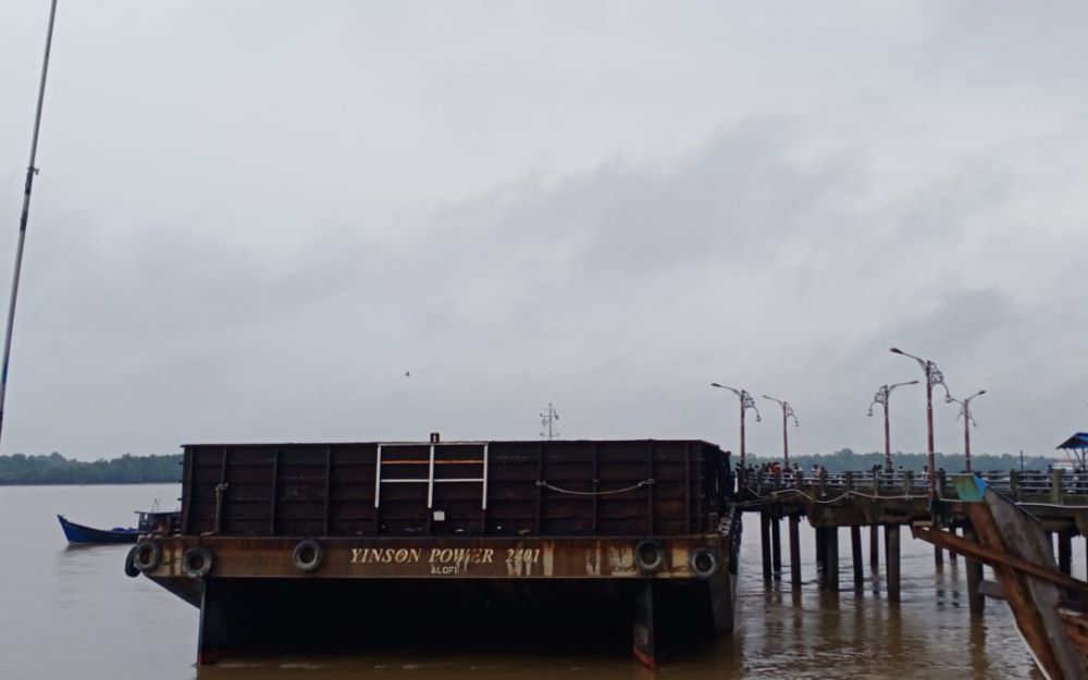 JAMBIUPDATE.CO, KUALATUNGKAL - sebuah kapal Tongkang yang berlayar di dalam Sungai pengabuan pada Kamis 22 April sekira pukul 13 menabrak jembatan Waterfront City Kota Kuala Tungkal. Kejadian tongkang yang menabrak jembatan Waterfront City ini terjadi saat cuaca di dalam Sungai pengabuan kurang bagus karena pada saat kejadian hujan lebat disertai angin kencang melanda kota Kuala Tungkal.