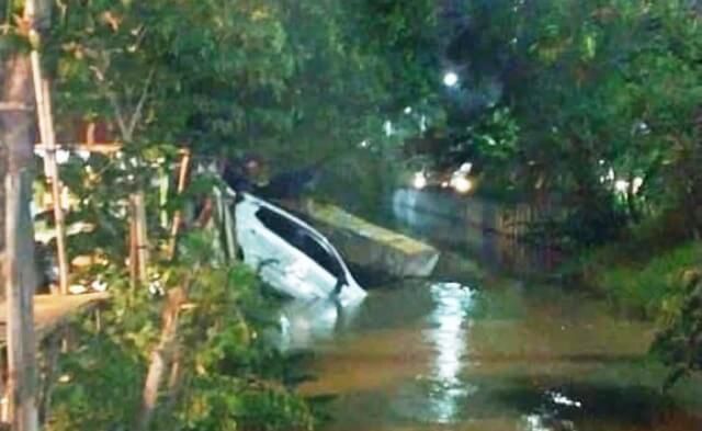 Dalam foto yang beredar di media sosial, bagian depan mobil berwarna putih itu tampak masuk ke permukaan badan kali.