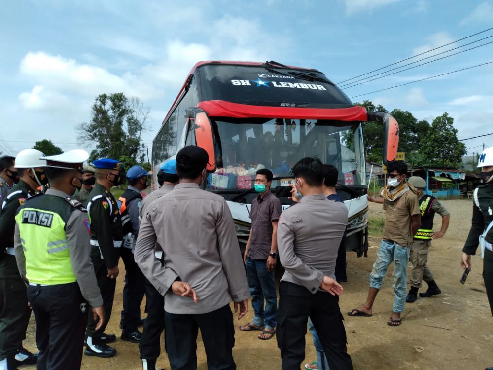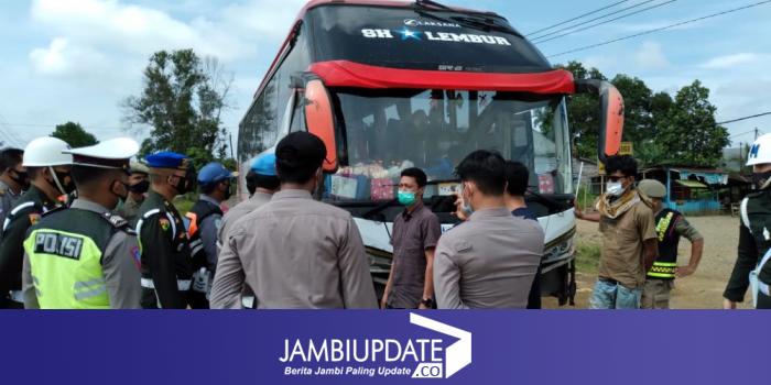 JAMBIUPDATE.CO, MUARA BUNGO - Nekat beroperasi dalam masa larangan mudik, satu unit bus Mutia Putri Mulia (MPM) dihentikan di pos penyekatan mudik, Jujuhan, Kabupaten Bungo. Bus asal Sumatra Barat ini diberhentikan, Kamis (6/5) pagi oleh petugas gabungan.