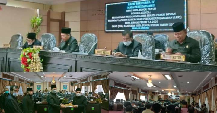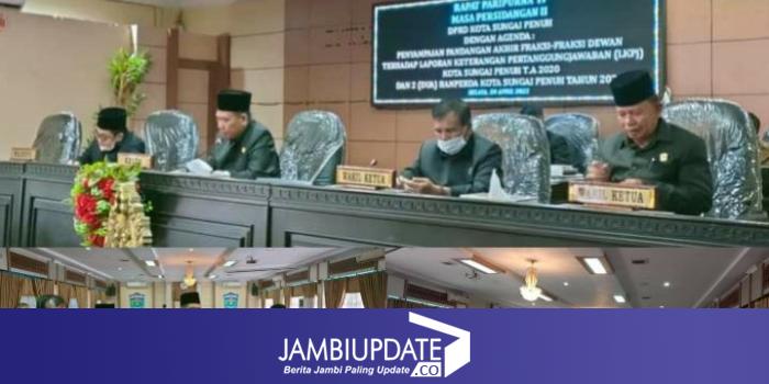 JAMBIUPDATE.CO, SUNGAI PENUH – Dewan Perwakilan Rakyat Daerah (DPRD) Kota Sungai Penuh menggelar Rapat Paripurna IV Masa Persidangan Ke II DPRD Kota Sungai Penuh, dengan agenda Penyampaian Pandangan Akhir Fraksi-Fraksi Dewan Terhadap Laporan Keterangan Pertanggung Jawaban (LKPj) Kota Sungai Penuh Tahun Anggaran 2020, Selasa (20/04/2021).