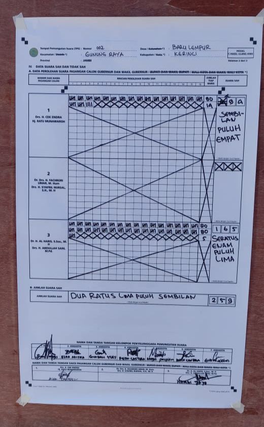 Dimana hasilnya di TPS 01 Desa Baru Lempur, Kecamatan Gunung Raya, pasangan 01 Cek Endra - Ratu berhasil meraih 68 suara sementara pasangan nomor 03 meraih 174 suara.