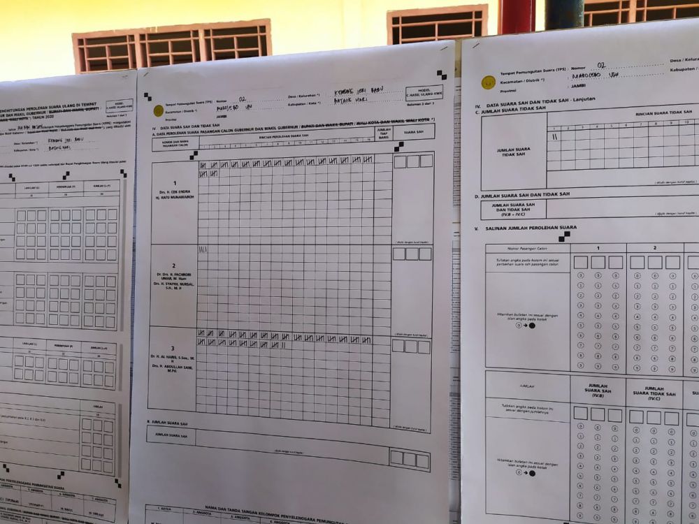 JAMBIUPDATE.CO, BATANGHARI - Hasil penghitungan suara pada Pemungutan Suara Ulang (PSU) Pemilihan Gubernur dan Wakil Gubernur Provinsi Jambi di TPS 02 Desa Kembang Seri Baru Kecamatan Maro Sebo Ulu sudah selesai. Kamis (27/05).