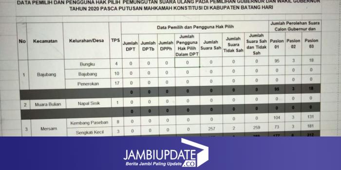 JAMBIUPDATE.CO, BATANGHARI - Hasil penghitungan suara pada Pemungutan Suara Ulang (PSU) Pemilihan Gubernur dan Wakil Gubernur Provinsi Jambi di dua TPS di Kecamatan Mersam sudah selesai, dua TPS tersebut yakni TPS 08 Desa Kembang Paseban dan TPS 03 Desa Sengkati Kecil.Kamis (27/05).