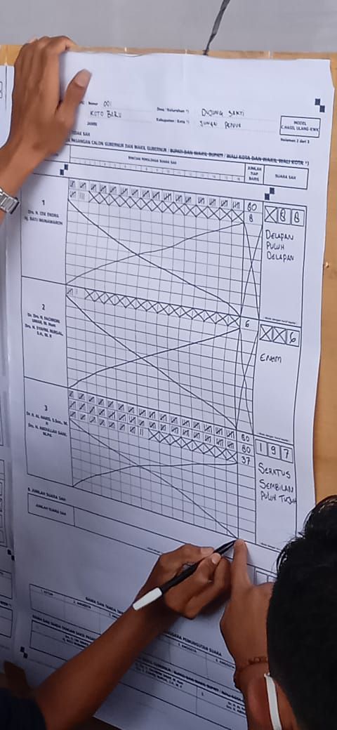 Dimana hasilnya di TPS 01 Desa Dujung Sakti, Kecamatan Koto Baru, pasangan 01 Cek Endra - Ratu berhasil meraih 88 suara, sementara pasangan nomor 03 meraih 197 suara.(adi)