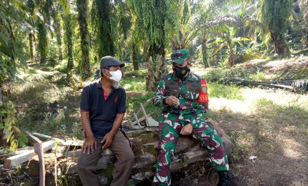 Melihat Sutaryo (59) warga Desa Bukit Beringin Kecamatan Bangko Barat Kabupaten Merangin Provinsi Jambi, istirahat sejenak di kebun sawitnya, Dansatgas menghentikan laju kendaraannya dan menghampiri warga tersebut, Sabtu (10/7/2021).