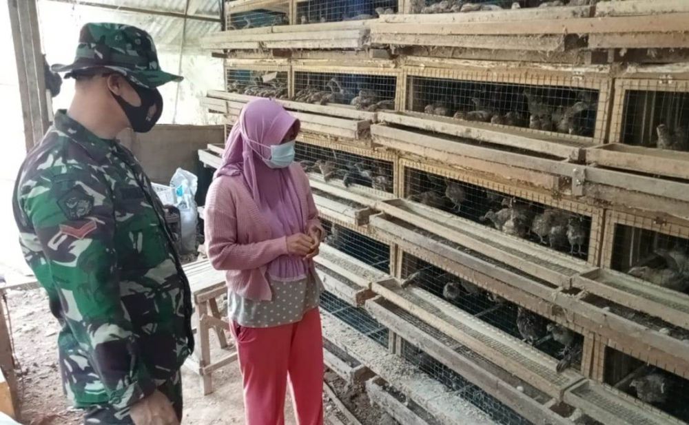 JAMBIUPDATE.CO, JAMBI- Break sejenak di siang hari dari pekerjaang menyelesaikan sasaran fisik, anggota satgas Kopda Bowie Nopria Marlah menyempatkan diri mengunjungu peternak ungas.