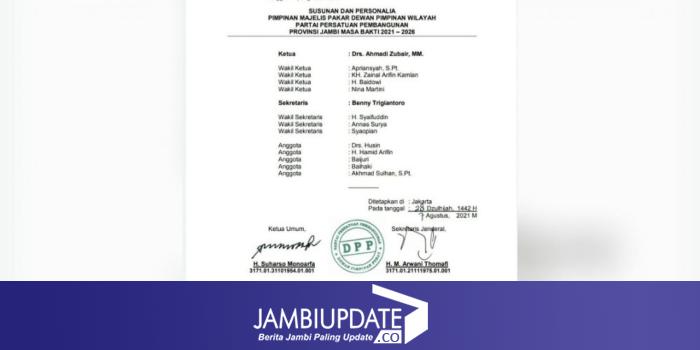 JAMBIUPDATE.CO, JAMBI - DPP PPP sudah menerbitkan SK kepengurusan DPW PPP Provinsi Jambi yang dipimpin oleh Bupati Batanghari Muhammad Fadhil Arief. Menariknya dalam SK tersebut, terdapat ada nama Walikota Sungai Penuh Ahmadi Zubir yang dipercaya menjadi Ketua Majelis Pakar dengan Sekretaris Benny Trigiantoro.