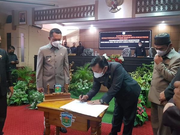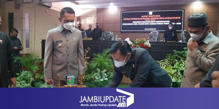 JAMBIUPDATE.CO, SUNGAIPENUH- Walikota Ahmadi Zubir didampingi Wakil Walikota Alvia Santoni bersama DPRD Kota Sungai Penuh menandatangani nota kesepakatan rancangan awal rencana pembangunan jangka menengah daerah (RPJMD) Kota Sungai Penuh 2021 - 2026.