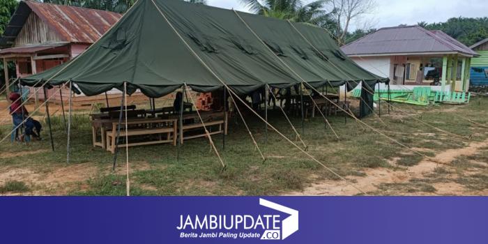 JAMBIUPDATE.CO, TEBO - Satgas TNI Manunggal Membangun Desa (TMMD) ke-112 Kodim 0416/Bungo Tebo di dusun Kemantan, Kelurahan Sungai Bengkal, KabupatenTebo dirikan tenda sementara sarana belajar murid SD pembantu Rt 17 Simpang Semangko selama gedung lama direhab satgas.