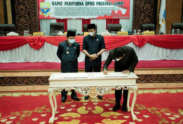 JAMBIUPDATE.CO, JAMBI– Dewan Perwakilan Rakyat Daerah (DPRD) Provinsi Jambi (18/9) menggelar rapat paripurna penyampaian penandatanganan nota kesepakatan bersama DPRD provinsi Jambi dan Gubernur Jambi terhadap rancangan Kebijakan Umum Perubahan Anggaran (KUPA) dan Prioritas Anggaran Sementara (PPAS) Perubahan APBD Provinsi Jambi tahun anggaran 2021. Rapat paripurna dipimpin langsung Ketua DPRD Provinsi Jambi Edi Purwanto, didampingi Wakil Ketua DPRD Provinsi Jambi Rocky Candra.