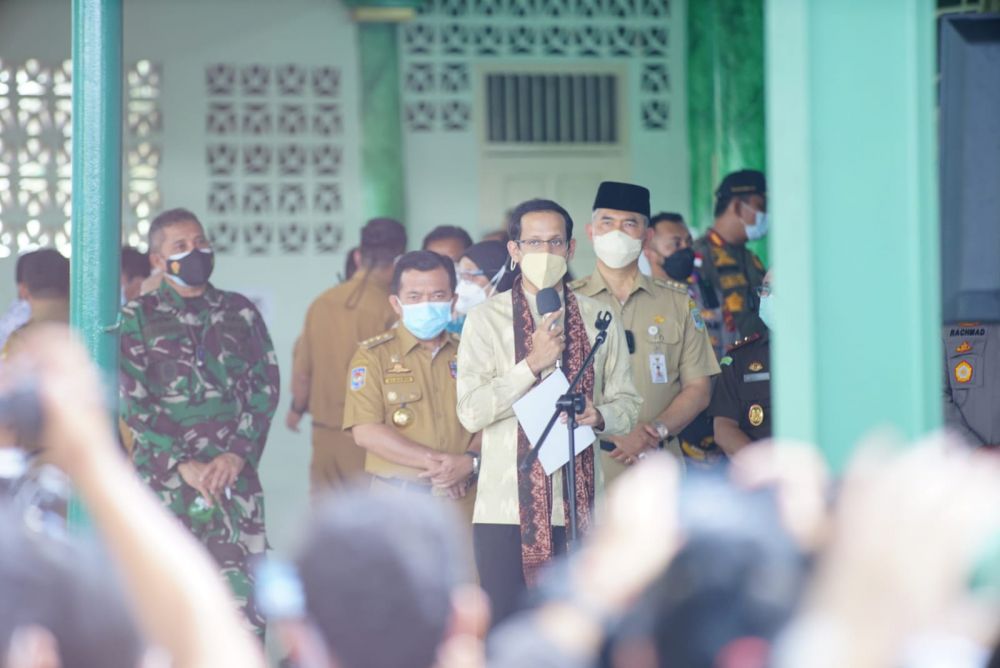 Nadiem yang didampingi Gubernur Jambi Al Haris dan Forkopimda lainnya, meninjau vaksinasi yang dilakukan kepada siswa guru, tenaga pendidik dan peserta didik usia 12 tahun keatas.