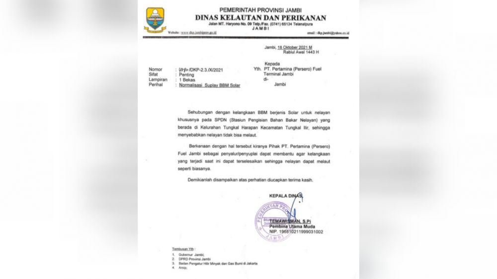 Faizal Riza juga mendesak Dinas KKP Provinsi Jambi utk membantu menindaklanjuti ke Pertamina Jambi secara tertulis.