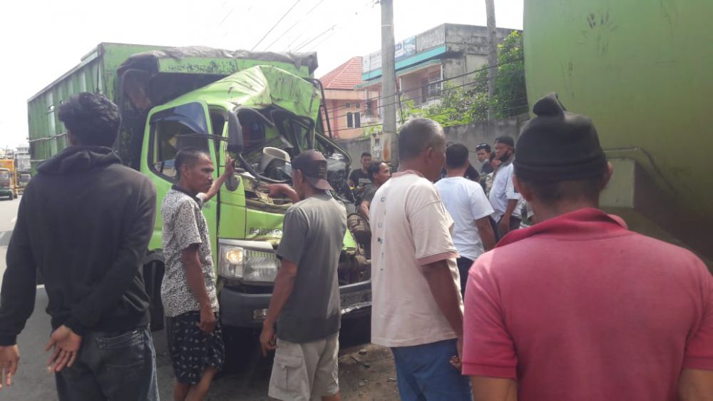 "Iyo bang, tadi kami lewat seberang jalan, kami lihat tibo-tibo bae truk itu numbur tronton dari belakang bang, kayaknyo sopir itu ngantuk bang," kata Ade.
