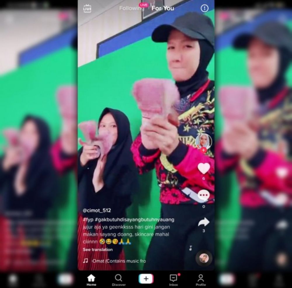 Dalam akun @cimot_512 itu, tampak perempuan dengan mengenakan kaos berlogo tribrata sambil menari dengan memegang setumpuk uang.