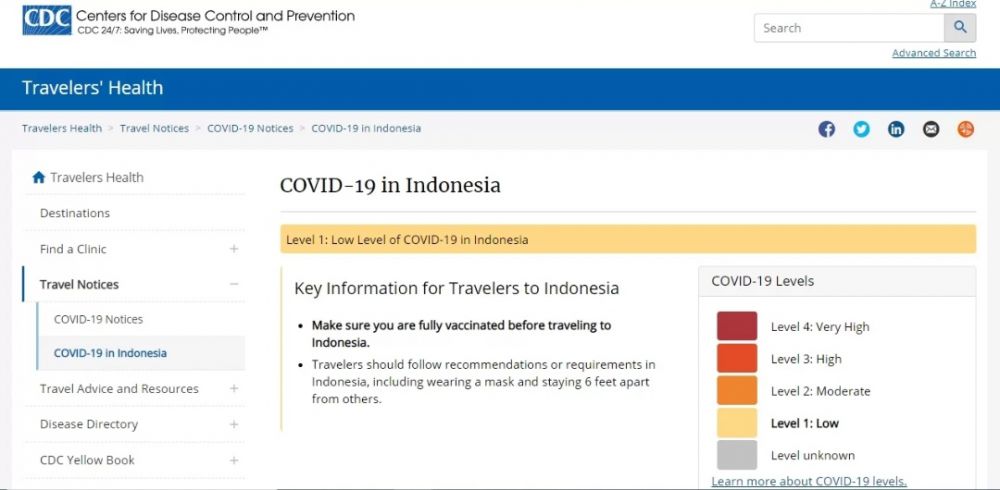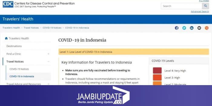 JAMBIUPDATE.CO, JAKARTA – Tren penurunan kasus COVID-19 di Indonesia, dinilai cukup berhasil. CDC Amerika Serikat (AS) menempatkan Indonesia pada level 1 COVID-19. Dikutip dari laman resmi CDC, Indonesia termasuk salah satu negara dengan tingkat risiko dan penularan COVID-19 rendah.