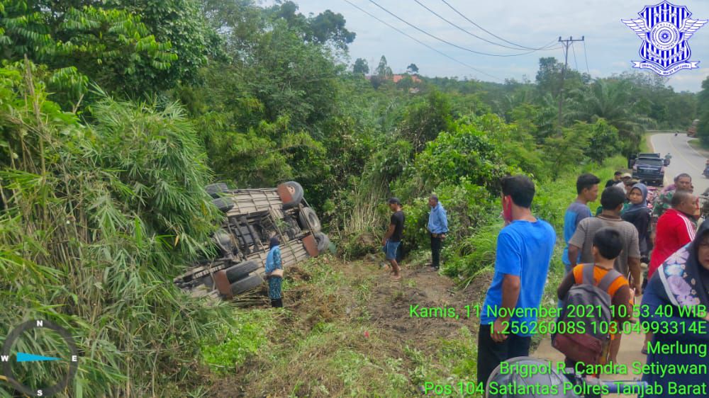 JAMBIUPDATE.CO, KUALA TUNGKAL - Bus Berpenumpang 40 orang terbalik di lintas Timur tepatnya di kecamatan merlung. Kejadian tersebut terjadi pada Kamis 11 November 2021 siang.