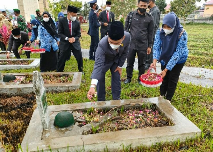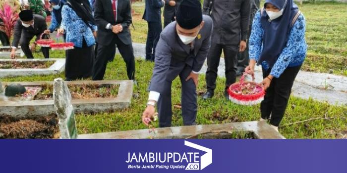 JAMBIUPDATE.CO, SUNGAIPENUH - Ketua DPRD Sungai Penuh, H. Fajran mengikuti upacara peringatan Hari Pahlawan di Taman Makam Pahlawan Bhakti Semumu, Kecamatan Depati Tujuh, Kerinci, Rabu (10/11/2021). Usai prosesi upacara, Fajran menyempatkan diri menaburkan bunga di makam pahlawan.