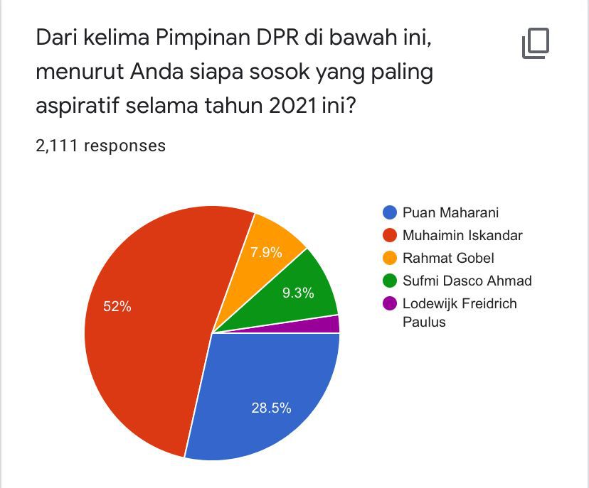 Polling diikuti oleh 2.111 responden dengan pertanyaan utama, “siapakah pimpinan DPR RI yang paling aspiratif sepanjang tahun 2021?”. Adapun yang menjadi tolok ukur penilaian terhadap kinerja Pimpinan DPR yang disertakan dalam keterangan, ialah terkait kinerja Pimpinan DPR dalam menjalankan fungsi pengawasan, fungsi budgeting, dan fungsi legislasi.