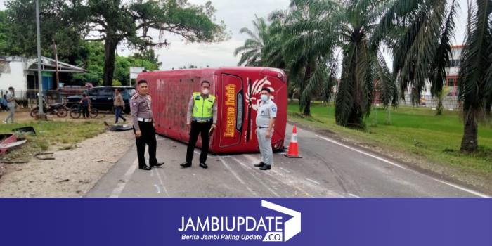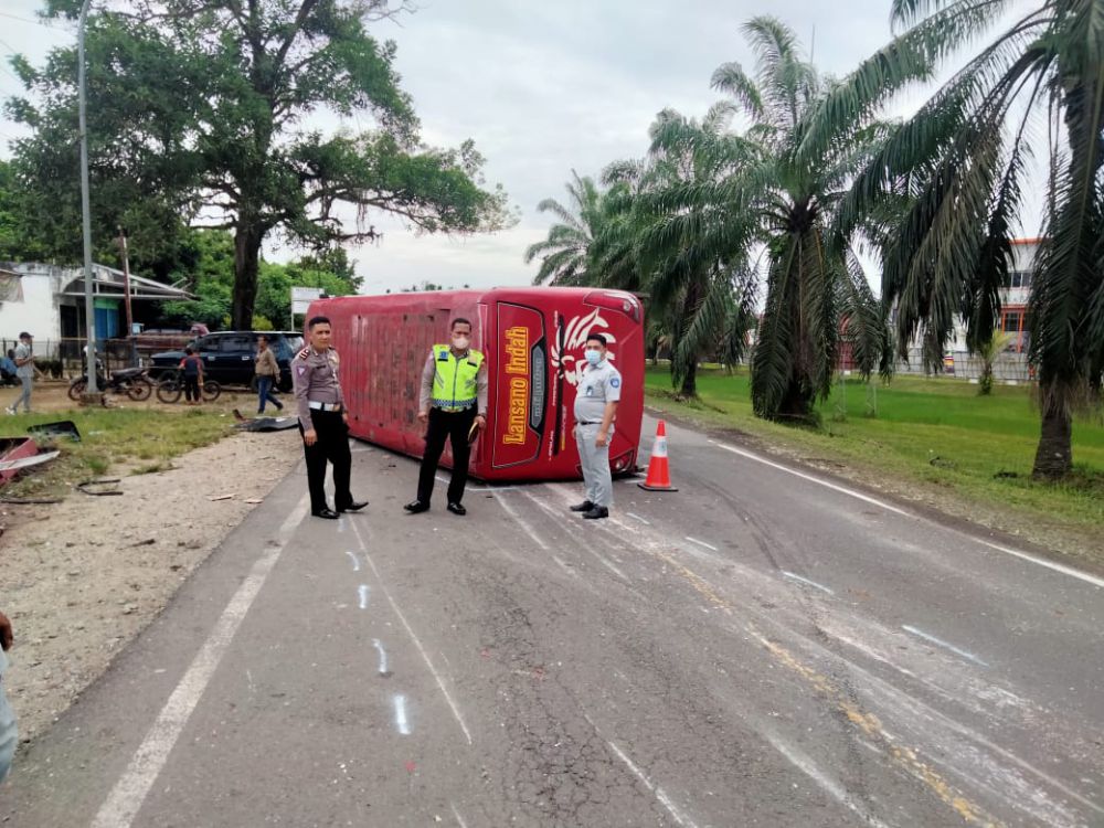 "Sehingga bus tersebut terbalik dan mengakibatkan satu orang penumpang mengalami luka-luka serta 7 orang penumpang dalam keadaan sehat jasmani rohani dan mobil bus tersebut mengalami kerusakan,"beber Erwin.(rza)