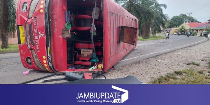 JAMBIUPDATE.CO, BATANGHARI - Kecelakaan lalulintas satu unit Bus dari Sumatera Barat dengan nomor polisi BA 7929 TU PO. Lubuk Basung Express mengalami Kecelakaan Tunggal di Jalan Lintas Jambi - Muara Bulian Rt.17 Kelurahan Teratai Kecamatan Muara Bulian tepatnya di Depan Mako Polres Batanghari sekira pukul 05.30 WIB. Kamis (10/02).