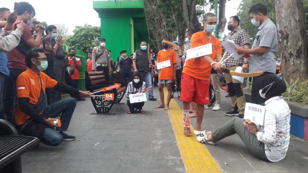 JAMBIUPDATE.CO, JAMBI- Tim Opsnl Reskrim Poresta Jambi menggelar rekontruksi kejadian pembacokan di Kawasan Tugu Keris Siginjai pada Minggu (23/1) lalu, dengan 9 pelaku peragakan 11 adegan dengan peran masing-masing, 1 pelaku diantaranya masih dalam daftar pencarian orang (DPO).