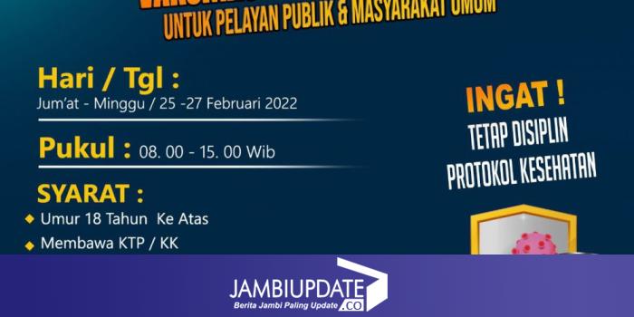 JAMBIUPDATE.CO, JAMBI- Polda Jambi akan adakan vaksinasi massal booster untuk pelayan publik dan masyarakat umum selama 3 hari yaitu pada Hari Jumat sampai Minggu, Tanggal 25-27 Februari 2022 Pukul 07.30 Wib s/d Selesai.