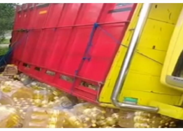 Ratusan minyak kemasan yang dibawa di belakang truk itu pun juga ikut berhamburan.