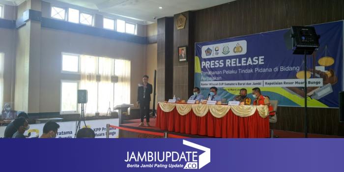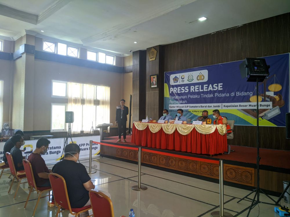 JAMBIUPDATE.CO, MUARA BUNGO- Kepolisian Resort Muara Bungo bersama Direktorat Jendral Pajak (DJP) Sumatera Barat - Jambi (Sumbaja) menggelar Konferensi Pers terkait dengan Penahanan Tersangka Tindak Pidana Perpajakan, inisial AS yang juga merupakan Bendahara Koperasi Unit Desa (KUD) JMJ, terdapat kerugian negara hingga ratusan juta.