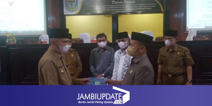 JAMBIUPDATE.CO, KERINCI- DPRD Kerinci akhirnya menyetujui laporan keterangan pertanggungjawaban (LKPJ) Bupati Kerinci tahun 2021. Hal ini disampaikan dalam rapat paripurna DPRD terkait penyampaian laporan pimpinan terhadap jalannya pembahasan, permintaan persetujuan, penyerahan keputusan DPRD dan pendapat akhir Bupati atas hasil LKPJ Bupati Kerinci tahun 2021, Senin (25/4/2022).
