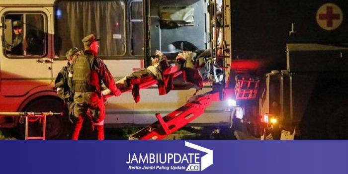Beberapa tentara yang dievakuasi terluka dan dibawa keluar dari bus dengan tandu.