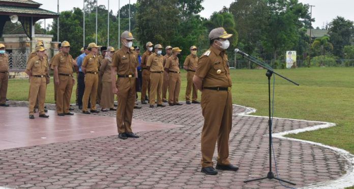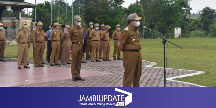 JAMBIUPDATE.CO, SAROLANGUN - Pejabat Bupati Sarolangun Henriza, dihari pertama menjabat, langsung memimpin apel perdananya di lapangan Gunung Kembang komplek perkantoran Bupati, senin (23/5/2022). Saat apel pagi tersebut, Henrizal meminta pihak BKPSDM untuk menyampaikan rekapitulasi absensi seluruh ASN maupun tenaga Honorer.