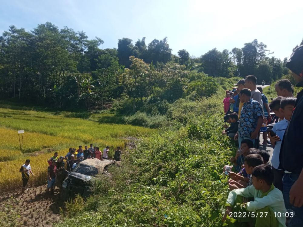 JAMBIUPDATE.CO, KERINCI - Sebuah mobil travel APV masuk ke terjun me sawah setinggi 20 meter dari badan jalan di Desa Tutung Bungkuk Siulak, Jumat (27/5/2022).