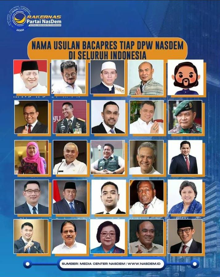 Lalu ada lagi nama kader Partai Nasdem yang juga anggota DPR RI Rahmat Gobel, Bendahara DPP Nasdem Syahroni, Ketua Bappilu DPP Nasdem Prananda Surya Paloh, mantan Gubernur NTB Tuan Guru Bajang dan nama-nama beken lainnya. Setidaknya ada 25 nama para tokoh yang masuk dalam usulan DPW se Indonesia.