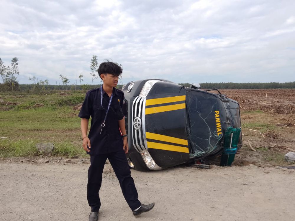 JAMBIUPDATE.CO, KUALATUNGKAL - Mobil Patwal milik Satuan Polisi Pamong Praja (Satpol PP) Pemkab Tanjabbarat, terbalik di dusun delima, Senin (20/6) pagi.
