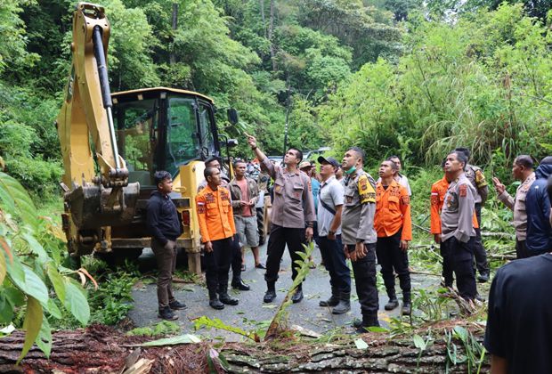 "Tingginya Curah Hujan sejak kamis sore yang di sertai angin kencang, menyebabkan sebagian jalan tertimbun longsor dan pohon tumbang, " jelas Kasat.