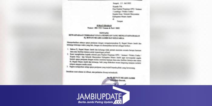 Dalam surat edara tersebut ditegaskan, Pj. Bupati Muaro Jambi dan keluarga tidak pernah meminta sesuatu berupa bantuan dana atau fasilitas lainnya untuk kepentingan pribadi.